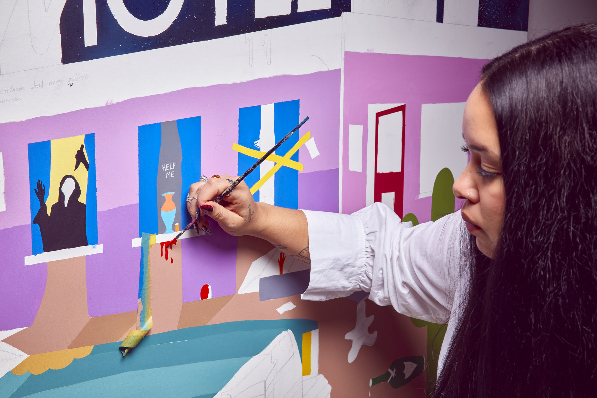 Drawing on her knowledge of art history and fascination with symbolism, Graceland London's work presents images of decadence and vice in the contemporary world; what she describes as the ‘darker side of the human ego’. Through playful candy colours and an aesthetic that takes inspiration from cartoons, she captures sinister worlds and explores consumption and mental health themes. Her bright use of colour and playful treatment of form is associated with optimism, yet in contrast her subject matter evokes a cynical tone.