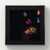Today is a study of life, represented by an individual peacock feather that is alive in its iridescent glory and potent with symbolic meaning to many cultures – from luck, wealth and beauty to perception, awakening and spirituality. The feather sways gently in the breeze as the viewer moves in front the artwork, while the butterflies also respond to this subtle interaction.