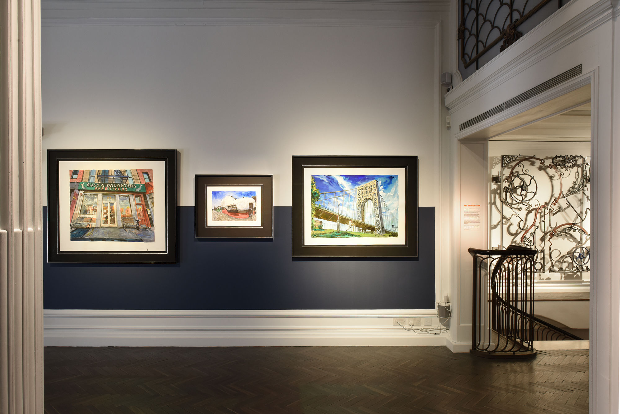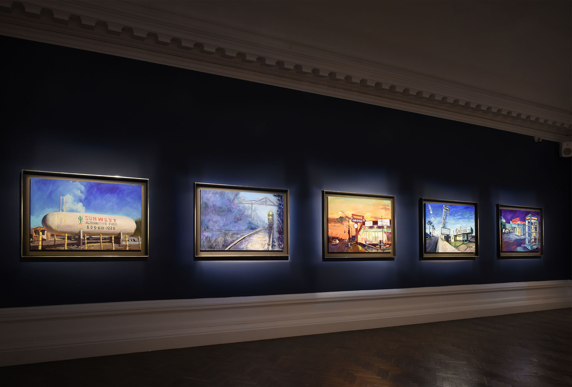 These recent works show Dylan's progression as a painter and a new maturity; the artist boldly depicts vast skies and changing light with confident, broad brushstrokes in a sheer celebration of colour. Dylan renders the changing face of America with ease; from the neon illuminations of a late-night ice cream joint in Nowhere and Anywhere, to an obscured Night Train, whose glowing headlights approach from the distance. New Orleans Street musicians; an abandoned jetty winding out to a deserted lake; the monolithic sweep of a bridge dissecting the sky overheard; all continue to create a panoramic vision of America.