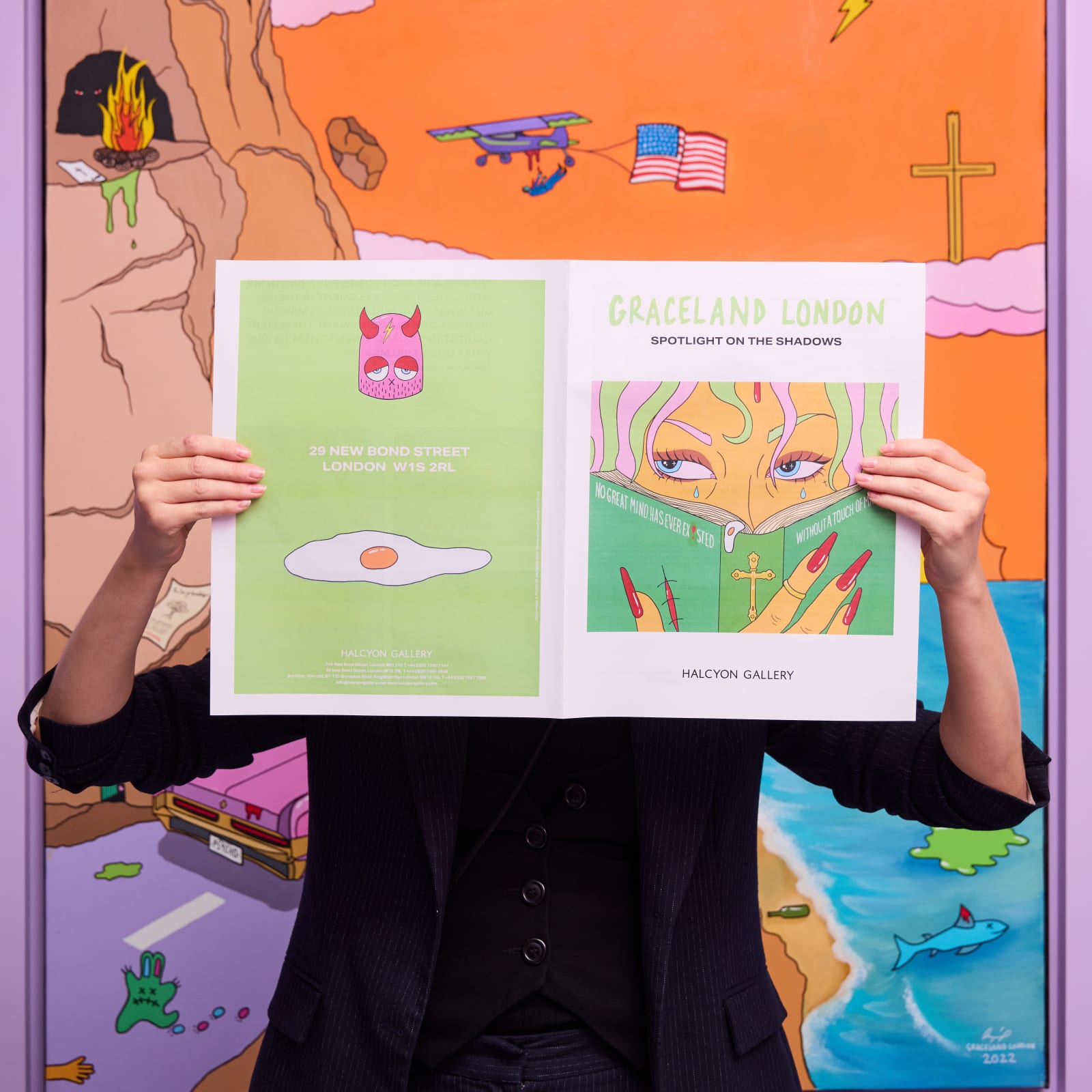 With her first solo exhibition at Halcyon Gallery, Graceland London invites us to explore her intoxicating, dystopian worlds which reveal the ‘darker side of the human ego’. To learn more about her original paintings, email us at info@halcyongallery.com