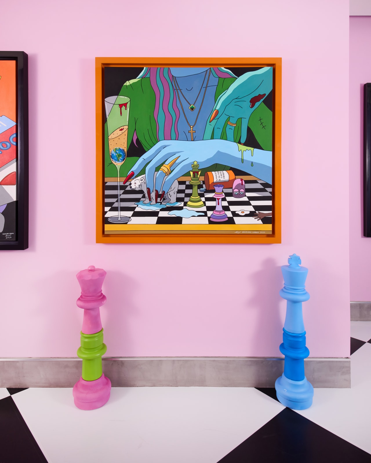 My artistic approach is a blend of tradition and innovation. I utilise the flat acrylic technique but incorporate a single use of traditional oil paint within each composition. This juxtaposition allows me to marry the vibrancy and immediacy of acrylics with the richness of oils. It’s a deliberate choice to do my work with a sense of depth and texture that creates visual interest. Integrating these two mediums, I want to create a dynamic visual experience that speaks to the intersection of tradition and modernity in art.