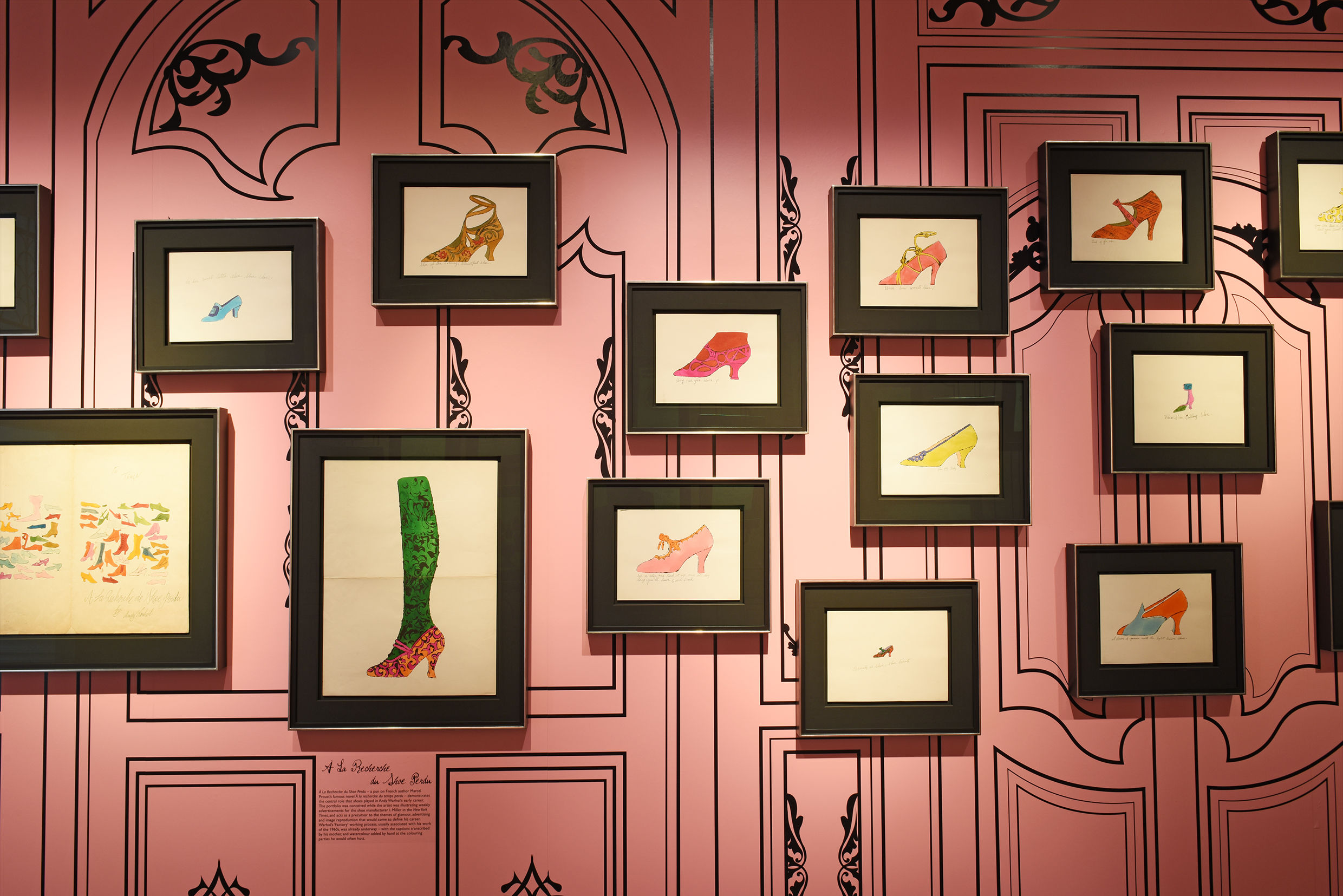 Subsequently, Warhol was the sole illustrator for shoe manufacturer I. Miller between 1955 and 1957, making new drawings of shoes each week for ads in the New York Times. The portfolio of artworks À la recherche du shoe perdu celebrates the central role that shoes played in his early career and imagination. The title is a riff on Marcel Proust's famous novel À la recherche du temps perdu (In Search of Lost Time, or Remembrance of Things Past). The captions accompanying Warhol's shoes, with their distinctive cursive lettering, were transcribed by Warhol's mother, Julia Warhola. They were witticisms derived from popular phrases: 'Uncle Sam wants shoe!' or 'See a shoe and pick it up, then all day long you'll have good luck!'. By 1959 Warhol had already established the 'Factory' working process he would become famed for, delegating work to various people around him. Warhol, his friends and his assistants hand-coloured the sheets at colouring parties organised by the artist, 'turning a mechanically reproduced image into a one-of-a-kind'.